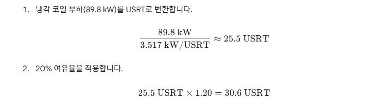 냉각 코일 부하를 냉동톤(USRT) 단위로 변환하고, 20%의 여유율을 적용합니다.