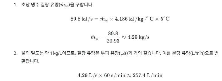 - 답: 냉수 순환량은 257.4 L/min 입니다.